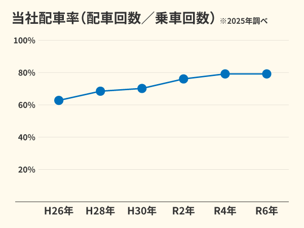 現在、約80台以上の車両を所持し、高知市屈指の配車依頼をいただいております。配車依頼をいただけるということは弊社がお客様に信頼いただいているという裏付けでもありますが、運転手さんからすると町中を走り回ってお客様を探す必要がなく、常にお客様を乗せてお仕事でき、安定して賃金をいただけます。車両も定期的に新しい車両を入れており、きれいな車両でお仕事することもできます。